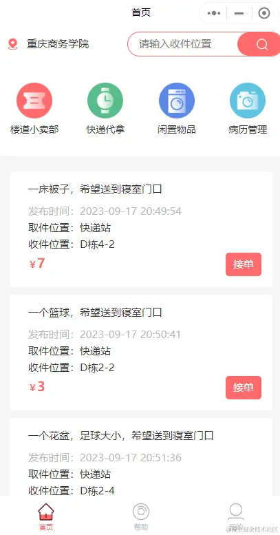 最近做了一个自研项目,校园跑腿,就是提供一个微信小程序,“图颜帮忙”在各大高校给学生使用。当有同学需要别人拿快递,拿外卖,代课等跑腿业务时,可以在上面发布任务。