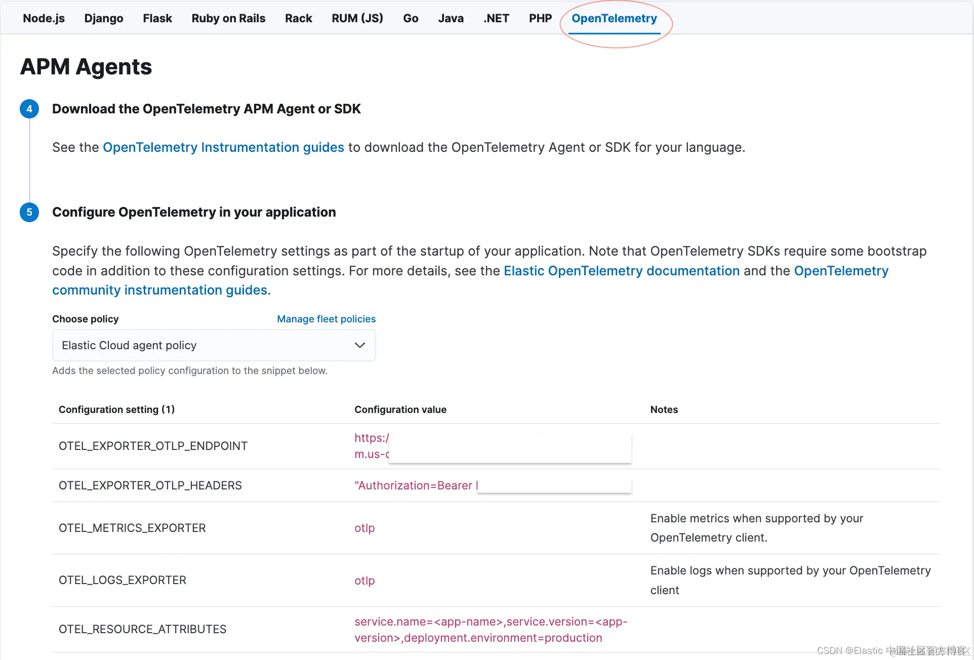 你可以从 Kibana 的路径 “/app/home#/tutorial/apm” 下复制端点和令牌。