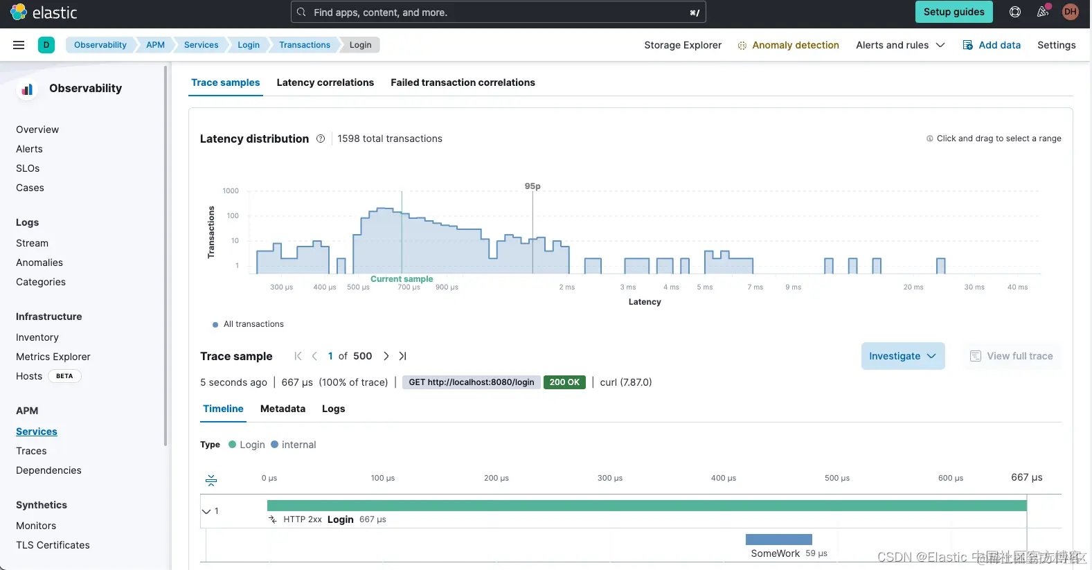 启动并运行此程序后,你可以 ping 检测服务的端点(在我们的示例中为 /login),你应该会看到该应用程序出现在 Elastic APM 中,如下所示: