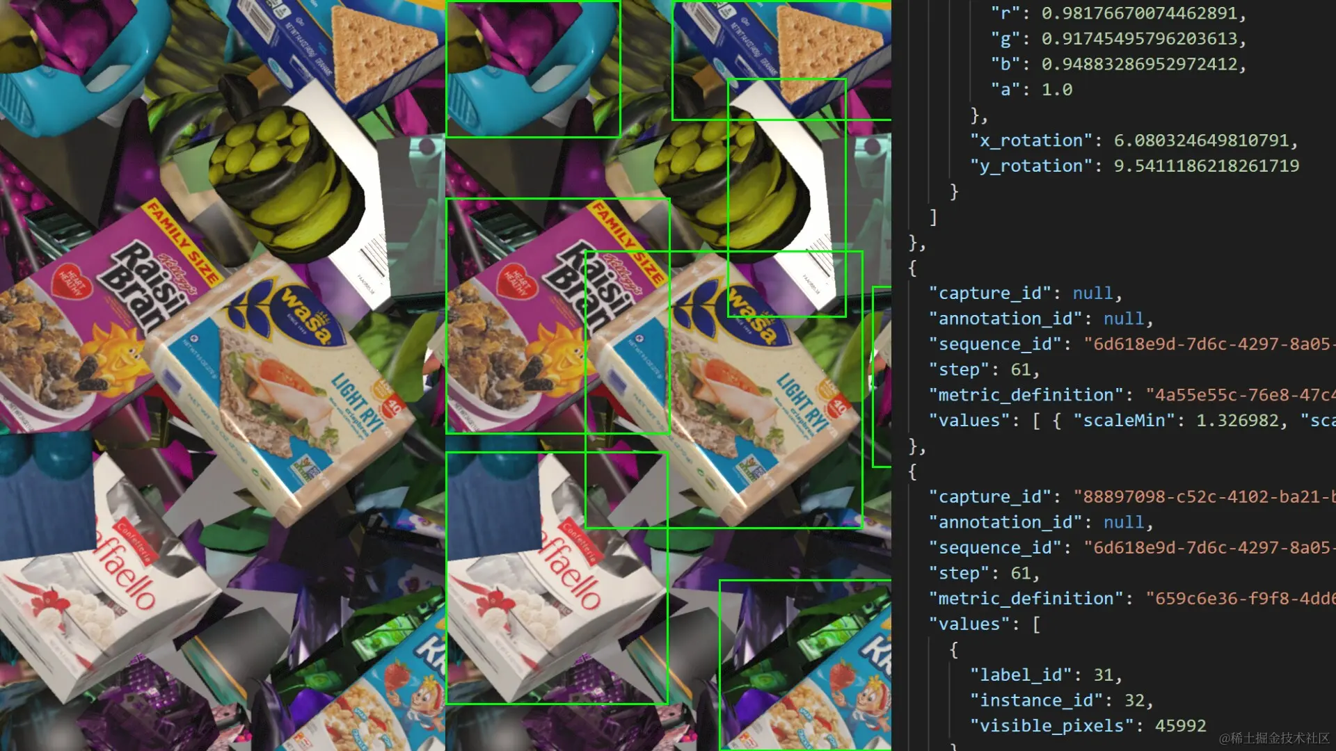 带有边界框和关联元数据 JSON 的合成数据示例