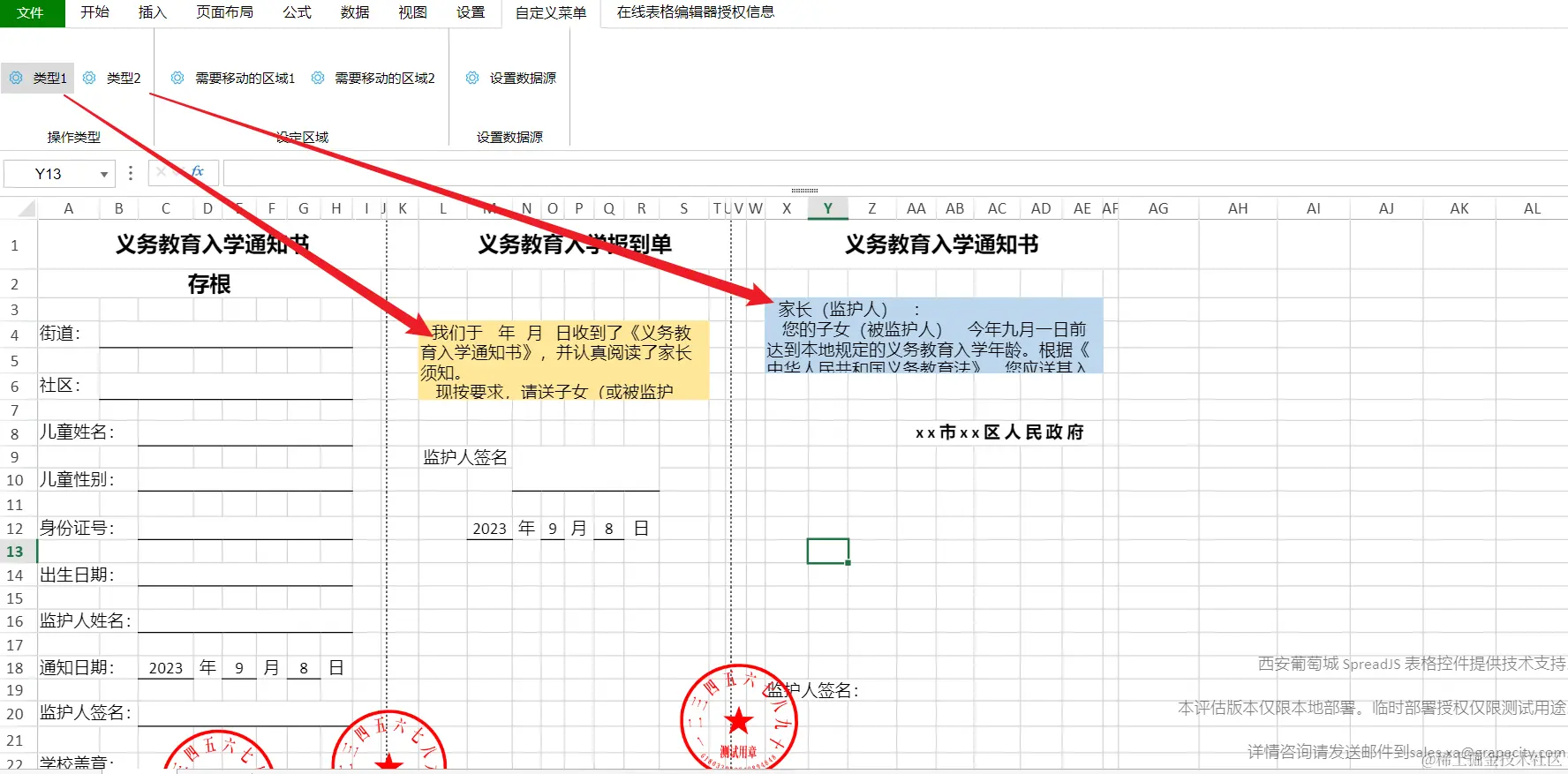 1. 部分单元格需要同时绑定多个字段,并将其组合为一段文字,比如上图中的义务教育入学报道单和义务教育入学通知书下方的两段话,它们包含了日期信息和学校名称信息。