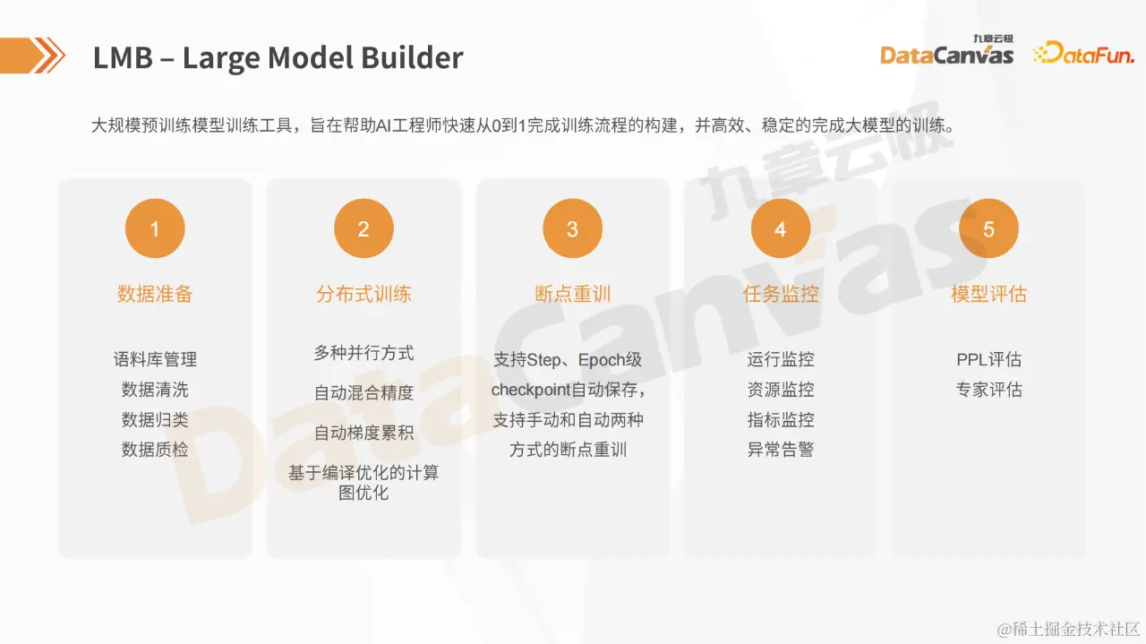 LMB(Large Model Builder)是一款专为 AI 工程师打造的大规模预训练模型训练工具,旨在帮助他们快速构建训练流程并实现高效稳定的大模型训练。该工具包括数据准备、分布式训练、断点重训、任务监控、模型评估几个主要模块。