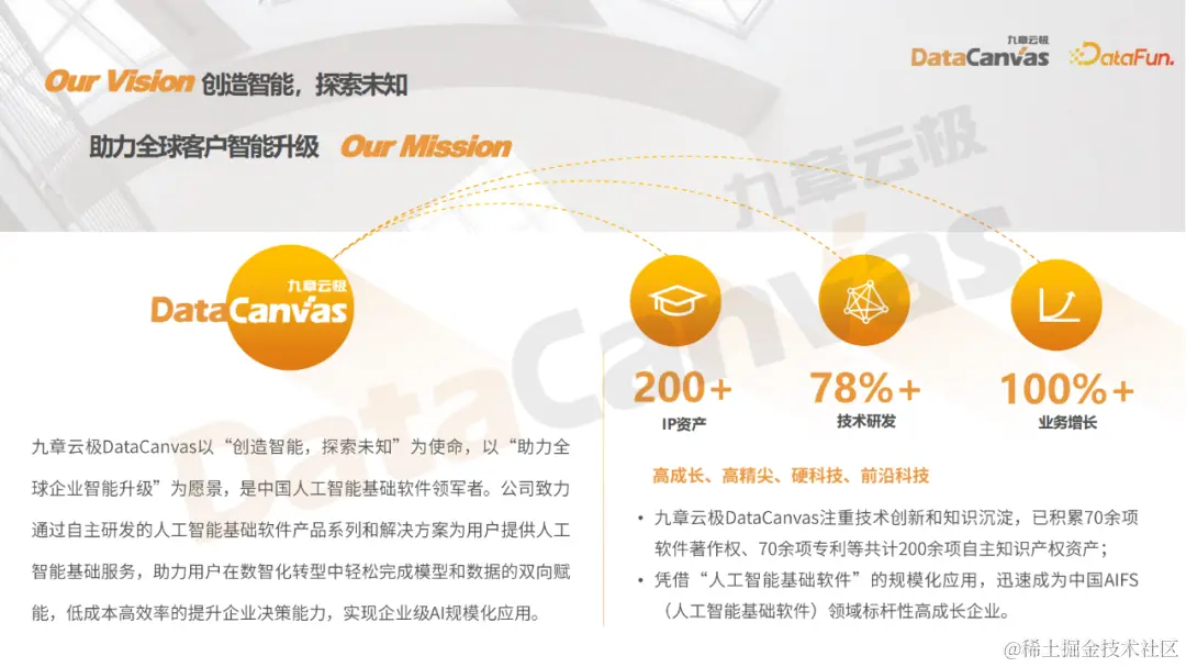 九章云极DataCanvas以创造智能探索平台为使命,怀揣着助力全球企业智能升级的愿景,是中国人工智能基础软件领域的佼佼者。公司专注于自主研发的人工智能基础软件产品系列和解决方案,为用户提供全面的人工智能基础服务,旨在帮助用户在数智化转型过程中轻松实现模型和数据的双向赋能,以低成本高效率的方式提升企业决策能力,从而实现企业级 AI 的规模化应用。