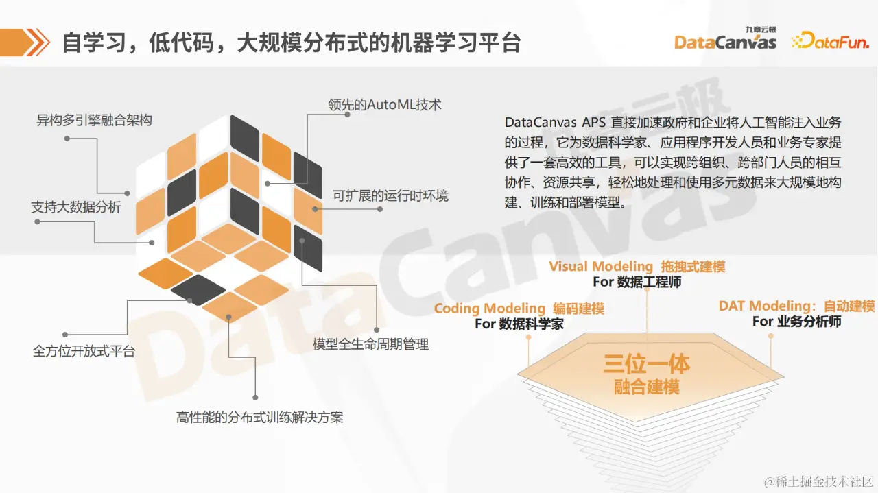 DataCanvas APS机器学习平台,为数据科学家、应用程序开发人员和业务专家提供一整套工具,以便自主轻松地处理多源异构数据,并快速、高效地开发、训练和部署任何规模的机器学习模型,打通企业级大模型和小模型应用的最后一公里。