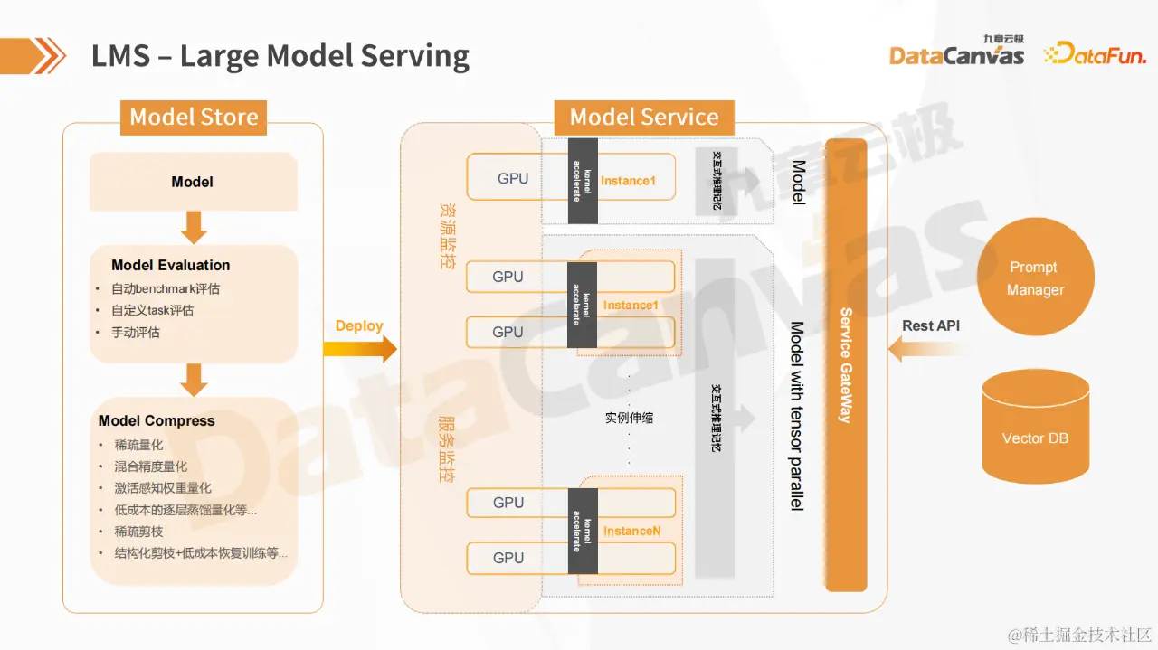 接下来,将深入探讨 LMS 的架构。参见上图,左侧是模型管理 Model Store 模块。在 Model Store 中,可以对已导入的模型进行全方位管理,如编辑元信息、评估模型性能等。模型评估涵盖了自动评估和自定义评估等多个方面。在对模型进行压缩之后,可以将其部署并上线。当然,也可以在导入模型后直接在 Model Service 中上线,跳过评估环节。