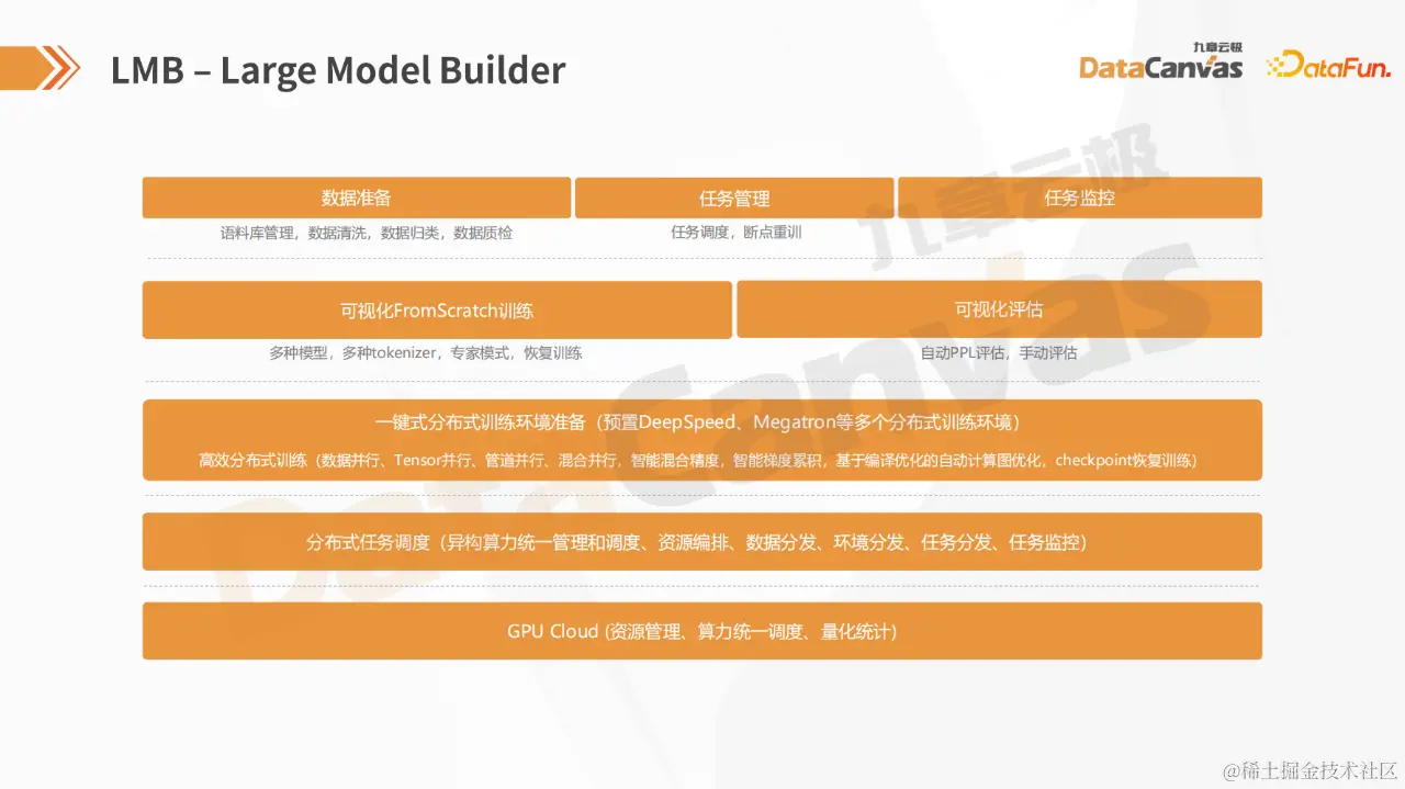 再往上的架构与 LMB 相似,提供了一个一键式分布式训练环境,包括DeepSpeed、Megatron、MosaicML等多种分布式训练环境,以及图优化、梯度累积等关键要素。