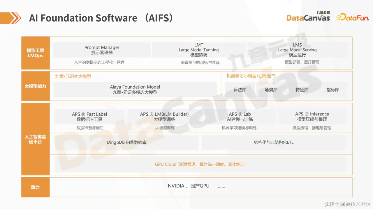 在大模型时代,我们需要更高效的算力基础设施,并对其他基础设施和资源进行管理。为了应对这些挑战,九章云极DataCanvas搭建了一个完整的软件体系AIFS(AI Foundation Software),包括模型工具、大模型能力、人工智能基础平台、算力管理四层。