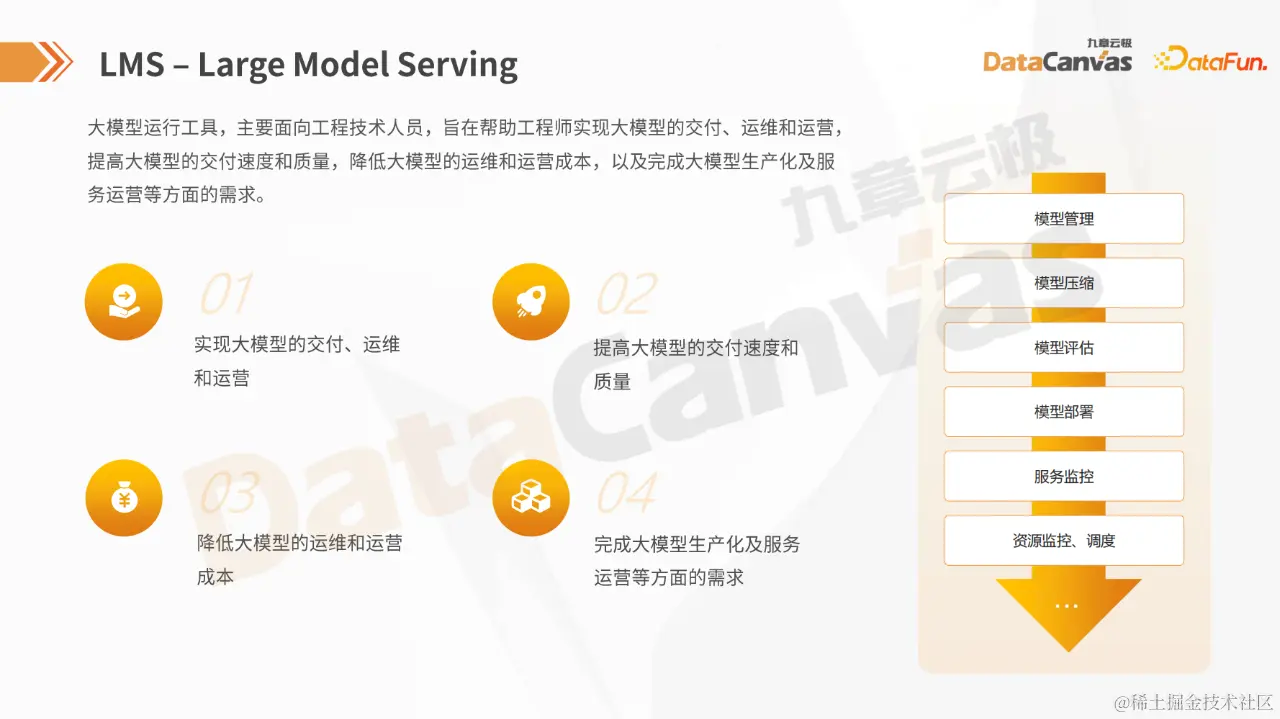 LMS(Large Model Serving),即大模型运行工具。所谓运行工具,就是在模型训练和对齐(如人工对齐)完成后,要通过 Prompt Manager 消费模型,因此需要将模型提供为一项服务,并通过 HTTP API 或 SDK 进行访问。LMS 主要面向工程技术人员,旨在帮助他们快速、高质量地交付大模型,同时降低运维和运营成本。