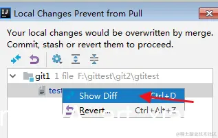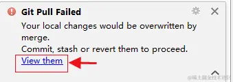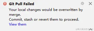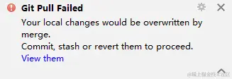 此时a已经将代码提交,但是b也修改了同样的位置,此时b使用pull功能会提示以下错误: