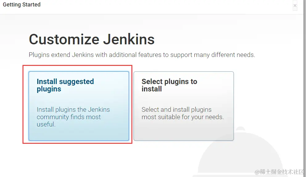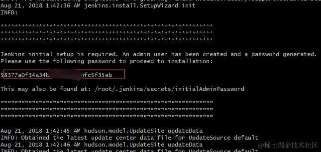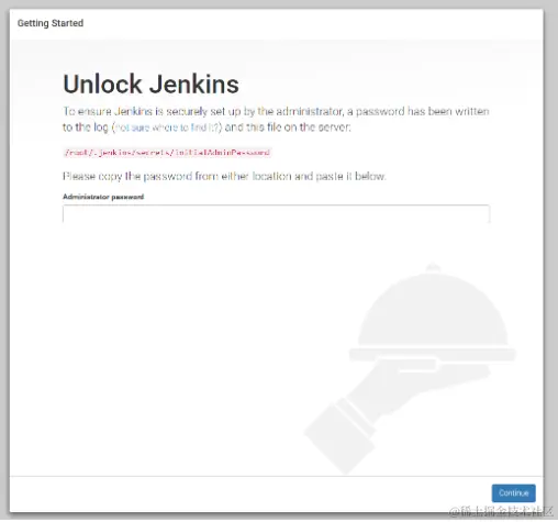 第一次启动Jenkins时,出于安全考虑,Jenkins会自动生成一个随机的按照口令。注意控制台输出的口令,复制下来,然后在浏览器输入密码: