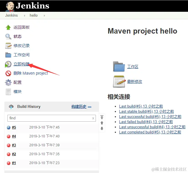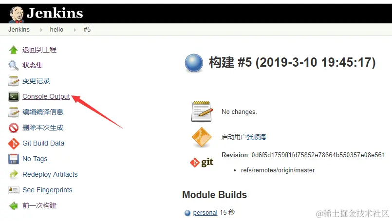 点进去可以查看本次构建信息,点击左侧的控制台日志。