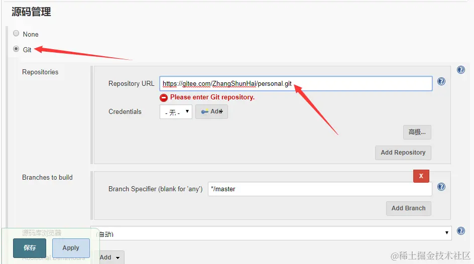 3、源码管理,选择git,配置Git相关信息