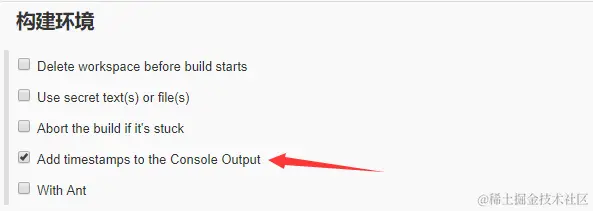 4、构建环境中勾选“Add timestamps to the Console Output”,代码构建的过程中会将日志打印出来