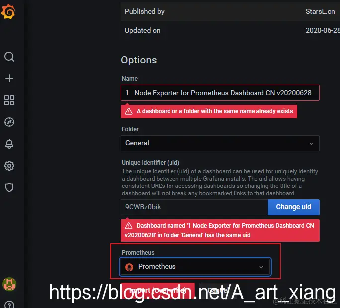 因为我已经导入过,所以这里提示错误,正常应该不报错,注意最下面要选择prometheus数据源