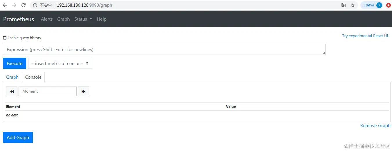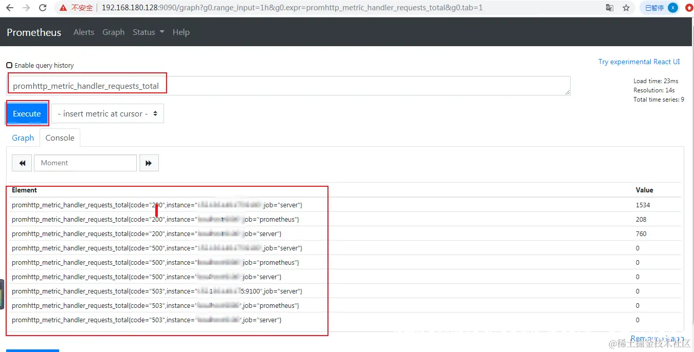输入:promhttp_metric_handler_requests_total 点击执行,有结果则表示成功