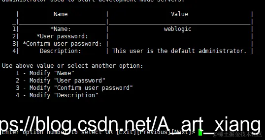 7.确定用户名密码,用户名默认weblogic,这里直接用默认的用户名,只需要修改密码。修改完毕密码之后,回车即可。