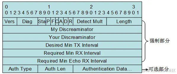 · 控制报文:封装在 UDP 报文中传送,对于单跳检测其 UDP 目的端口号为3784,对于多跳检测其 UDP 目的端口号为 4784。