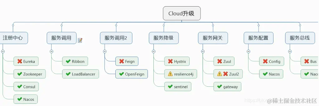 其中Eureka、Feign、Hystrix、Zuul、Config、Bus已经过时,停更了。