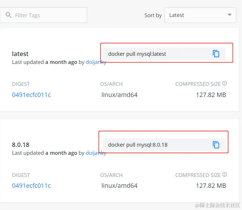 可以通过 Sort by 查看其他版本的 MySQL,默认是最新版本 mysql:latest 。