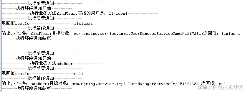 System.out.println("输出,方法名:" + method + ";目标对象:" + target + ";返回值:" + result);