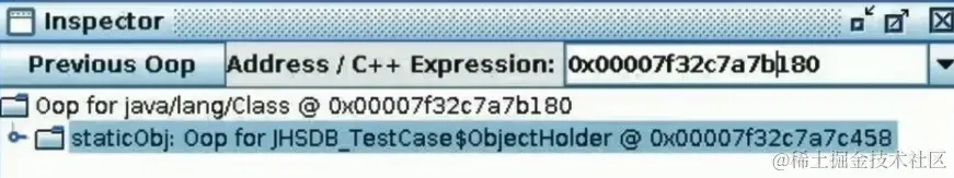 接着,找到了一个引用该staticObj对象的地方,是在一个java.lang.Class的实例里,并且给出了这个实例的地址,通过Inspector查看该对象实例,可以清楚看到这确实是一个java.lang.Class类型的对象实例,里面有一个名为staticObj的实例字段:
