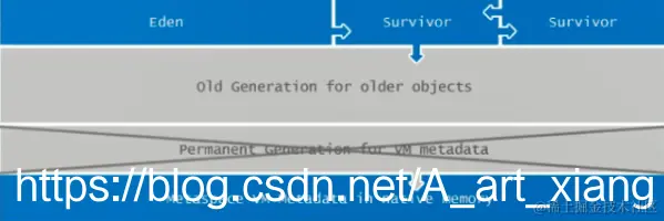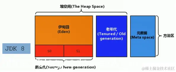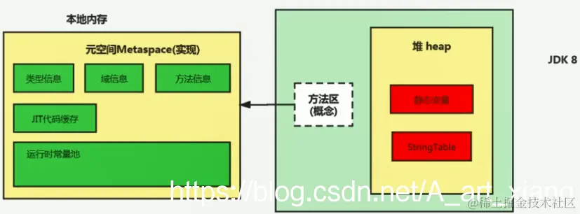 | jdk1.8及以后 | 无永久代,类型信息、字段、方法、常量保存在本地内存的元空间,但字符串常量池、静态变量仍在堆 |