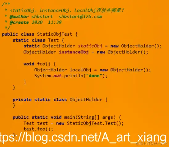 staticObj静态变量随着Test的类型信息存放在方法区,instanceObj成员变量随着Test的对象实例存放在Java堆,localObject局部变量则是存放在foo()方法栈帧的局部变量表中。