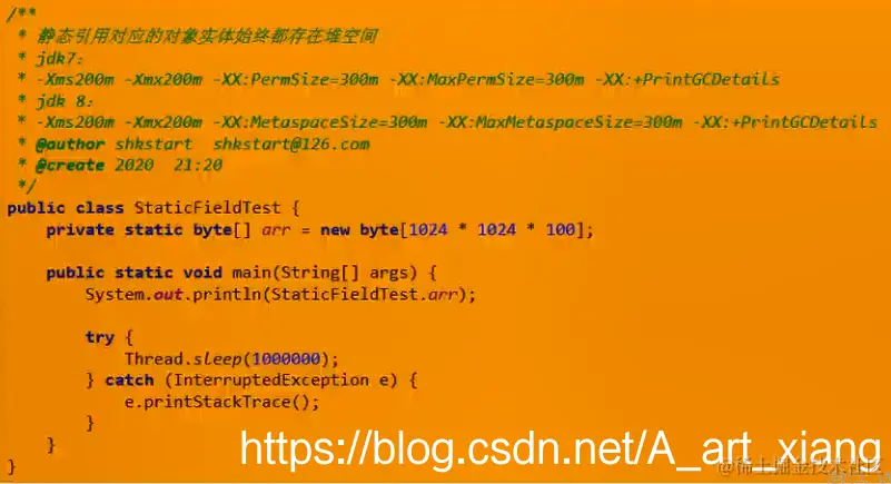 结论:静态引用,对应的对象实体(new的东西)始终都存在堆空间中(不管jdk几)。