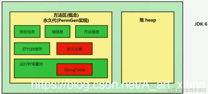 | jdk1.6及以前 | 有永久代(permanent generation),静态变量存放在永久代上 |