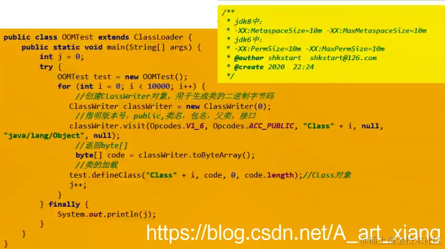 4.方法区的大小决定了系统可以保存多少个类,如果系统定义了太多的类(加载大量第三方jar包、timcat部署的工程过多、大量动态生成反射类),导致方法区溢出,虚拟机同样会抛出内存溢出错误:java.lang.OutOfMemoryError: PermGen space(jdk7以前)或者java.lang.OutOfMemoryError: Metaspace(jdk8以后)