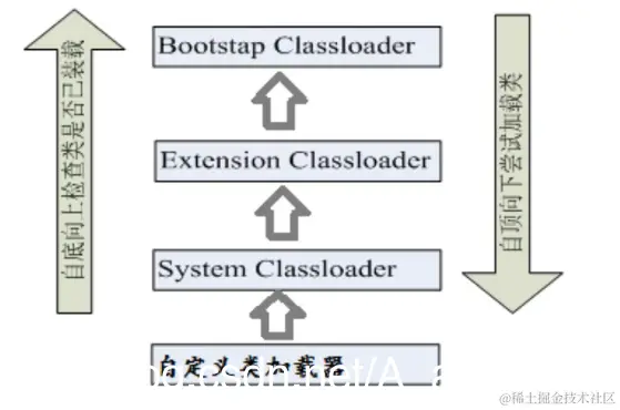 加载优先顺序:引导类加载器(Bootstap Classloader)=>扩展类加载器(Extension Classloader)=>系统类加载器(System Classloader/Application Classloader)。