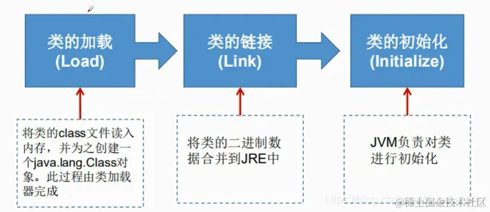 当程序主动使用某个类时,如果该类还未被加载到内存中,则系统会通过如下三个步骤来对该类进行初始化。
