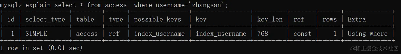 查询一下看看是否走了索引: