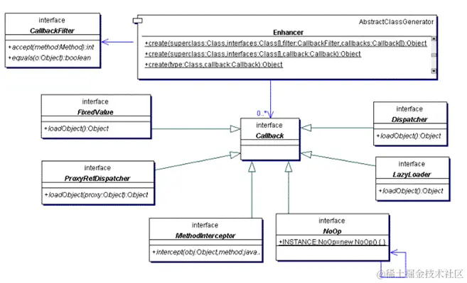 net.sf.cglib.proxy.Callback接口在CGLIB包中是一个重要的接口,所有被net.sf.cglib.proxy.Enhancer类调用的回调(callback)接口都要继承这个接口。