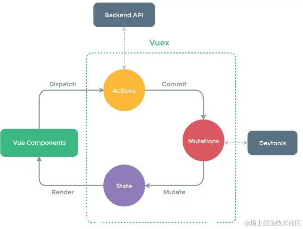 (1)定义actions(其中需要调用mutations方法进行参数的修改,具体参照官网的图)