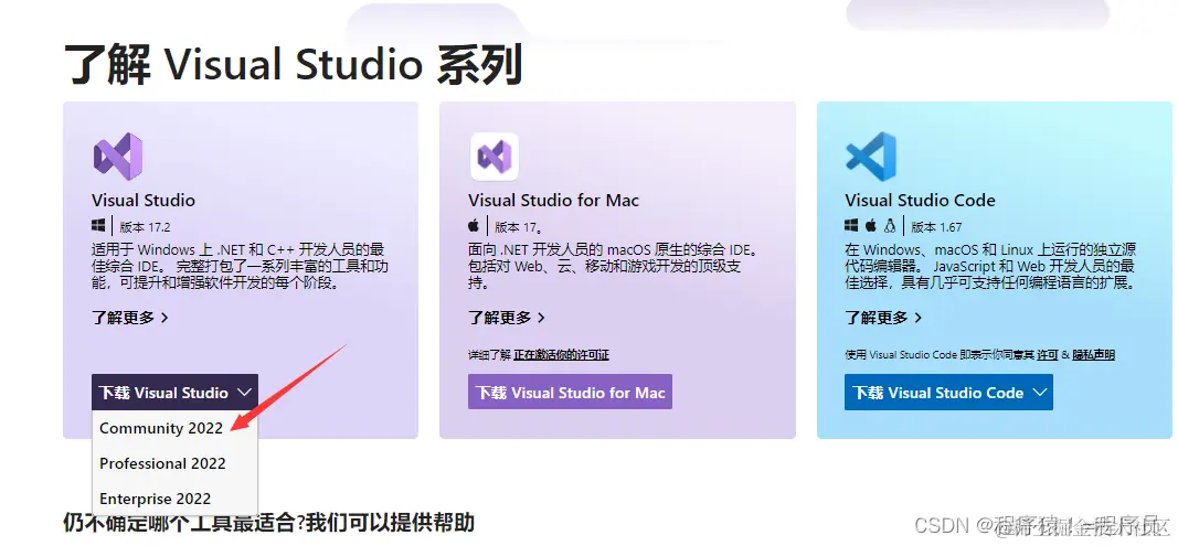 软件介绍 Visual Studio是微软推出的一款C++编译器,将“高级语言”翻译为“机器语言(低级语言)”的程序,VS是一个非常完整的开发工具集,包括了所有软件生命周期中所需的大部分工具,如UML工具、代码管控工具、集成开发环境(IDE)等等。 一、VS安装1.VS下载官网:点这里