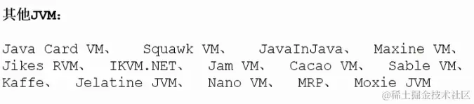 Classic VM、Exact VM、HotSpot VM、BEA公司(已经被oracle收购)的JRocket、IBM的J9、KVM和CDC/CLDC HotSpot(针对Java ME)、Azul VM、BEA Liquid VM、Zing VM、Apache Harmony、Microsoft VM、Taobao VM、Dalvik VM(执行dex文件,通过class转换来的)