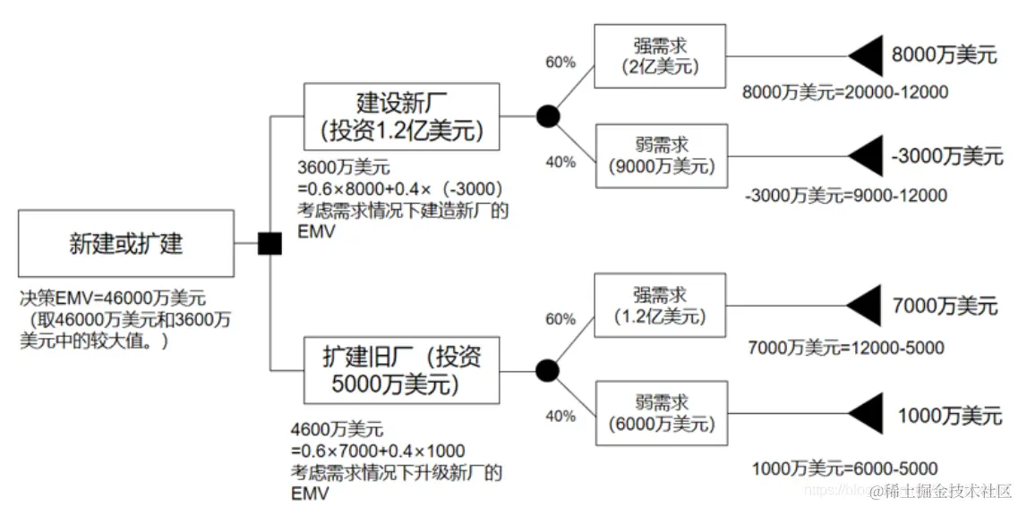 ② 预期货币价值分析(EMV):把每个可能结果的数值与其发生的概率相乘,再把所有乘积相加,就可以计算出项目的EMV。会用到决策树分析。