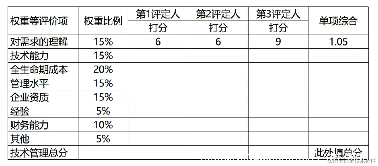 可以使用综合评价标准进行供方选择。表14-2是某项目对供应商的评价表。假定每个评价项满分为10分。表14-2中,针对“对需求的理解”评价项,3个评定人的打分分别为6、6、9。平均为7分,最后7乘以权重比例0.15,得到“对需求的理解”的单向综合分为1.05,以此类推,每个供应商有一加权后的技术管理总分,加上价格方面的分数之后(原则是价格低应获得价格方面的高分),得到供应商的总分。对所有供应商的总分排序,以确定谈判顺序,然后选择一个卖方,并要求签订标准合同。