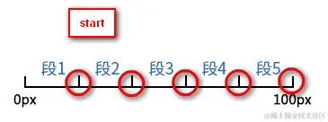 - start:表示直接开始。也就是时间才开始,就已经执行了一个距离段。于是,动画执行的5个分段点是下面这5个,起始点被忽略,因为时间一开始直接就到了第二个点: