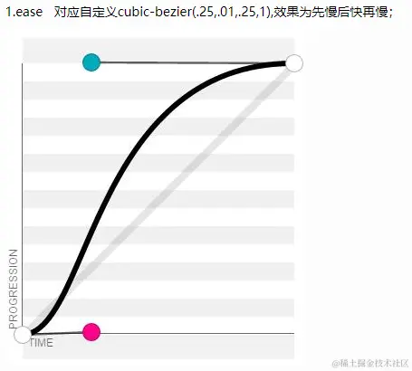 - ease 默认。动画以低速开始,然后加快,在结束前变慢(由快到慢,逐渐变慢)。等同于贝塞尔曲线(0.25, 0.1, 0.25, 1.0)
