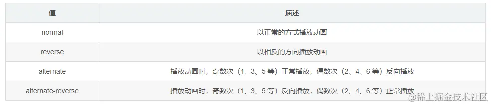 animation-direction 属性用来设置是否轮流反向播放动画,属性的可选值如下: