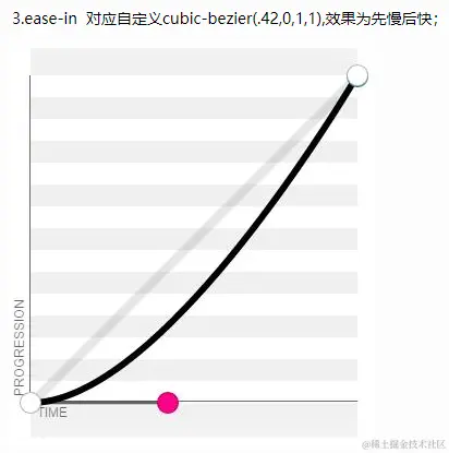 - ease-in 动画以低速开始(由慢到快,速度越来越快)。等同于贝塞尔曲线(0.42, 0, 1.0, 1.0)