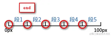 - end:表示戛然而止。也就是时间一结束,当前距离位移就停止。于是,动画执行的5个分段点是下面这5个,结束点被忽略,因为等要执行结束点的时候已经没时间了: