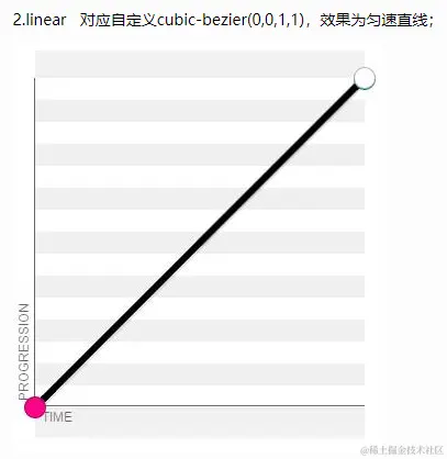 - linear 动画从头到尾的速度是相同的(匀速)。等同于贝塞尔曲线(0.0, 0.0, 1.0, 1.0)