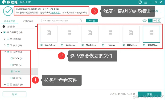 步骤3:快速扫描完成后,用户将看到一个文件列表,可以点击 【按类型查看】,展开文件列表,查看里面的文件,如果没有找到需要恢复的文件,点击 【深度扫描】;