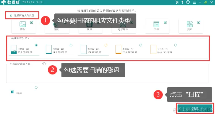 步骤2:勾选所需恢复的文件类型,如果想对磁盘进行全面的扫描,建议用户全选,然后选择一个需要扫描的磁盘,点击【扫描】;
