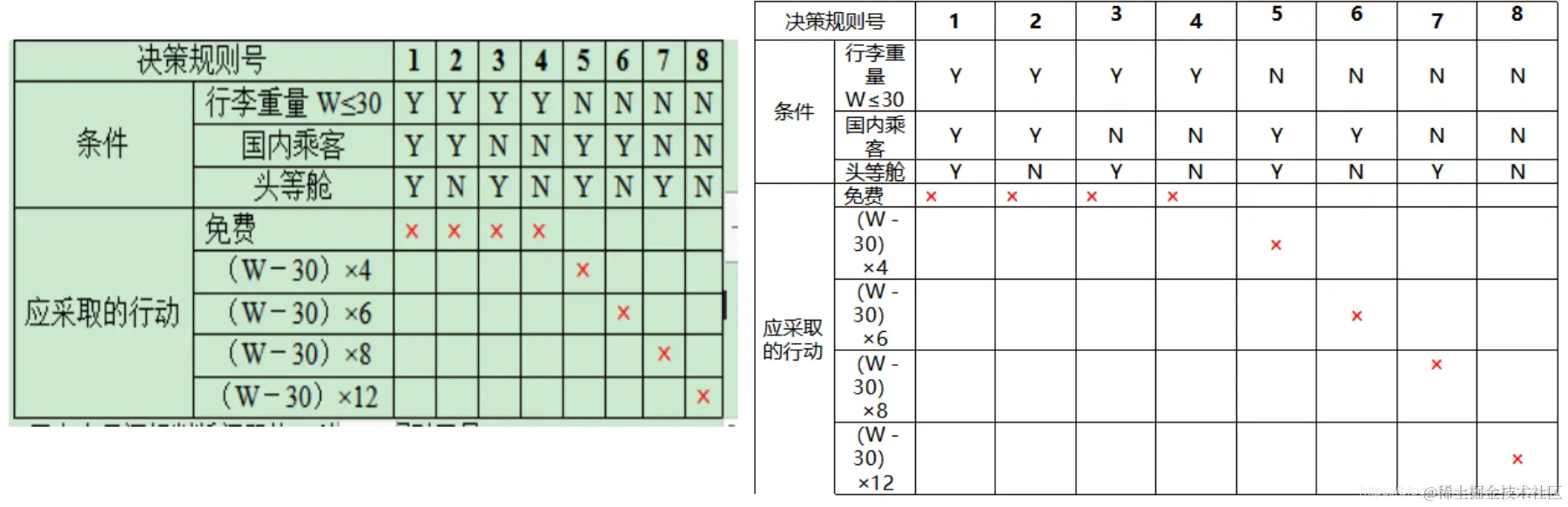 6、判定表。判定表采用表格形式来表达逻辑判断问题,表格分成四个部分,左上部分为条件说明,左下部分为行动说明,右上部分为各种条件的组合说明,右下部分为各条件组合下相应的行动。