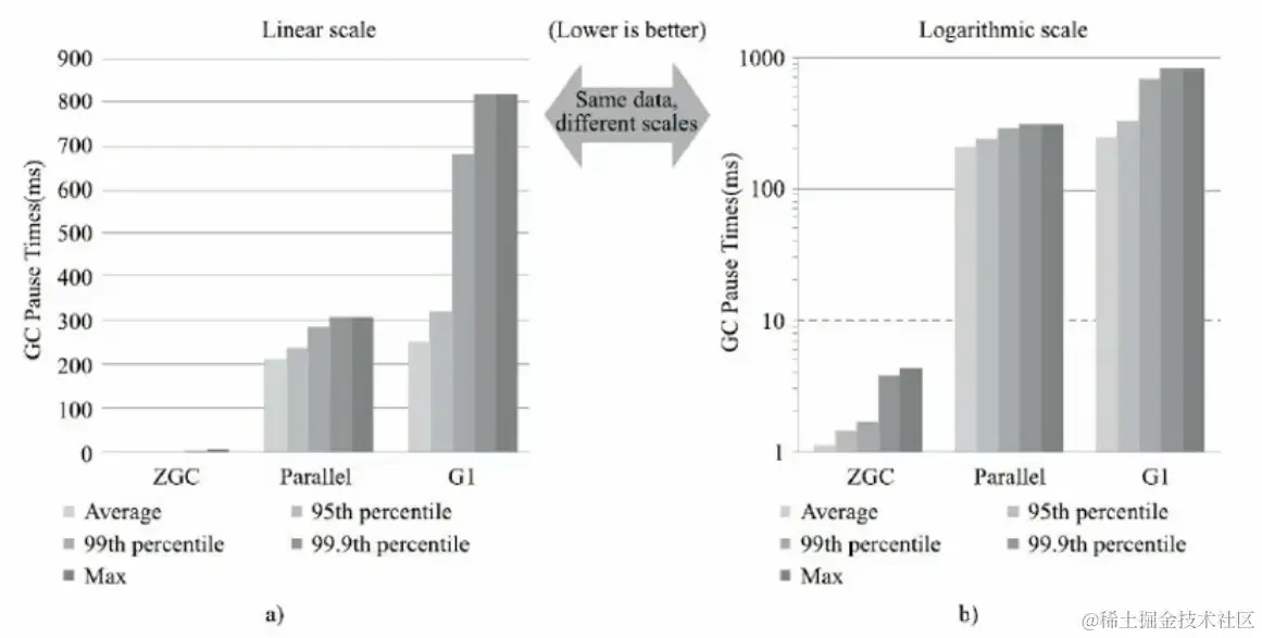 5.在ZGC的强项停顿时间测试上,它毫不留情的将Parallel、G1拉开了两个数量级的差距。无论平均停顿、95%停顿、99%停顿、99.9%停顿,还是最大停顿时间,ZGC都能毫不费劲控制在10毫秒以内。
