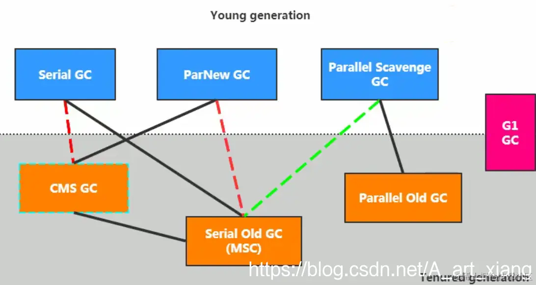 1.两个收集器之间有连线,表明它们可以搭配使用。